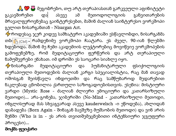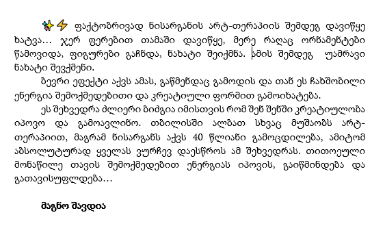 “ნისარგანის არტ-თერაპიას 90-იან წლებში სამხატვრო აკადემიაში დავესწარი. მახსოვს მაშინ ბევრის გაკვირვება, საოცარი ნახატები დახატეს ადამიანებმა, რომლებსაც ფუნჯი საერთოდ არ აუღიათ ხელში. არ გაუშვათ ეს შესაძლებლობა. დიდი ბედნიერება გველოდება თითოეულ მონაწილეს” – ამბობს მხატვარი ირმა ლეჟავა.