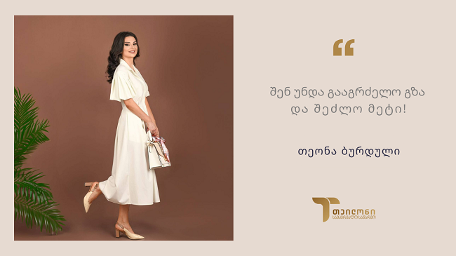 თეონა ბურდული: ჩემი მთავარი მამოძრავებელი ძალა ყოველთვის საქმის სიყვარული და პასუხისმგებლობა იყო და ასე იქნება მომავალშიც. სწორედ ამის შედეგია ბრენდი „თეილონი“, – საწარმო, რომელიც ხარისხს, სანდოობას და პროფესიონალიზმს აერთიანებს.